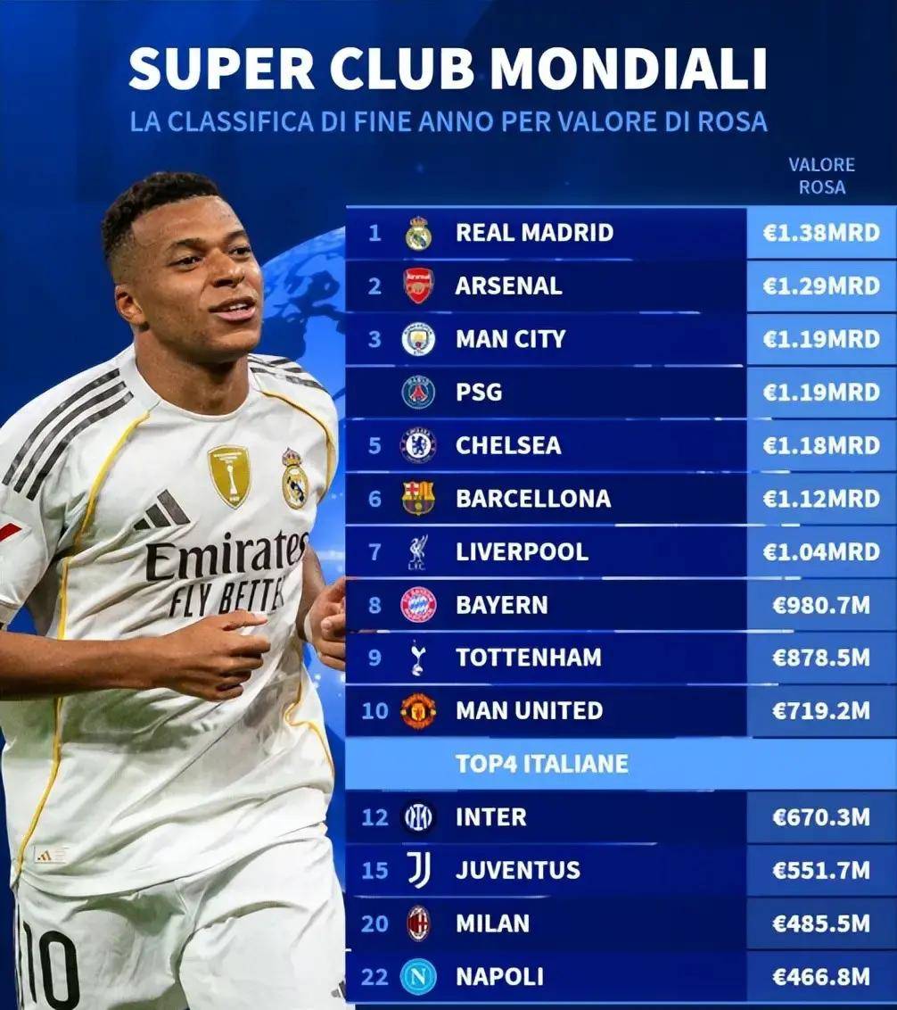 2025年全球俱乐部价值榜单公布啦。意甲球队的情况差别很大。AC米兰在困难的情况下强势复苏,它凭借4.855亿欧元的评估价值进入了全球前20,成了意甲的一个亮点。米兰阵容年轻,竞技状态变好,重建计划也有了效果,这让它不再走下坡路,让意甲能在顶尖俱乐部里占个位置。